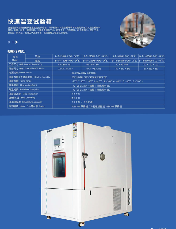 快速溫變?cè)囼?yàn)箱為實(shí)現(xiàn)溫度變化針對(duì)產(chǎn)品的可靠性驗(yàn)證,主要為航空、 航天、汽車、材料、石油、化工、電子、通訊等科研及生產(chǎn)單位提供溫度變 化環(huán)境,供用戶對(duì)整機(jī) (或部件) 、電器、儀器、材料等作溫度應(yīng)力篩選試 驗(yàn),以便考核試品的適應(yīng)性或?qū)υ嚻返男袨樽鞒鲈u(píng)價(jià),真實(shí)地反映電工電子 產(chǎn)品在實(shí)際使用過程中對(duì)溫度環(huán)境變化的適應(yīng)性,暴露產(chǎn)品的缺陷,是新產(chǎn)品研制、樣機(jī)試驗(yàn)、產(chǎn)品合格鑒定試驗(yàn)全過程必不可少的重要試驗(yàn)手段